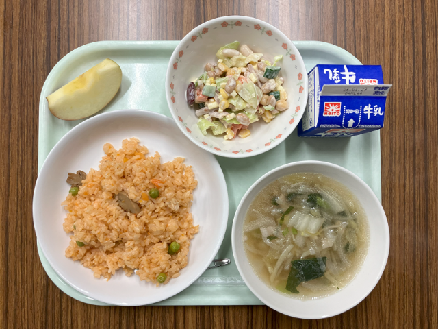 【献立】牛乳 チキンライス ビーンズサラダ 千切り野菜のスープ りんご