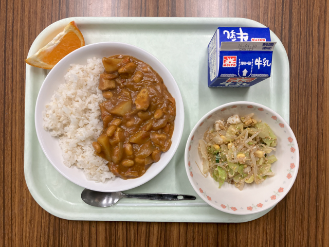 【献立】牛乳 白樺派のカレーライス 豆腐とじゃこのサラダ いよかん