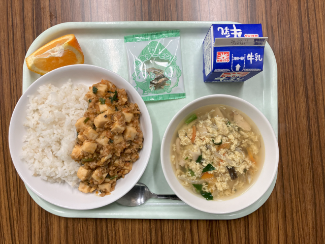 【献立】牛乳 麻婆丼 中華五目スープ お魚アーモンド いよかん