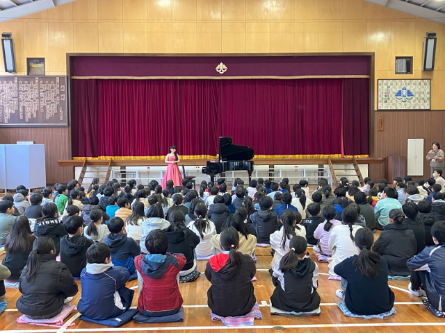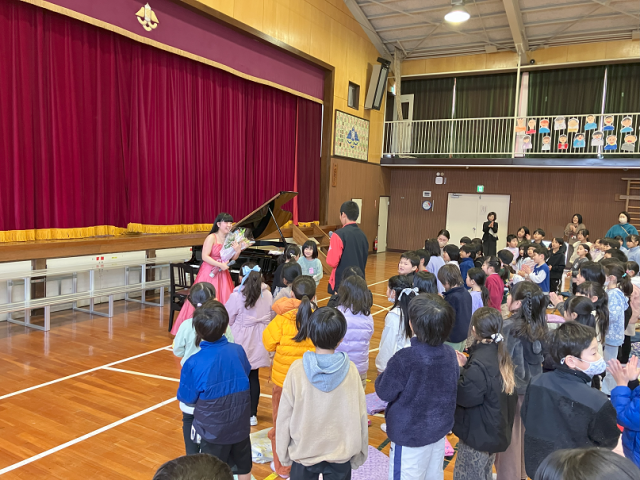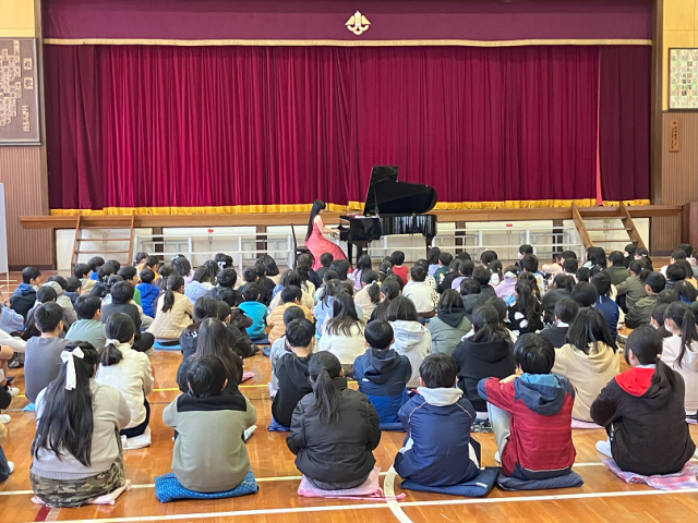 今日は、プロのピアニストを目指して留学中で我孫子市出身の方をお招きして、全校でピアノ演奏鑑賞会を行いました。短い時間でしたが、素晴らしい生演奏を聴いて、子どもたちは大きな拍手を送っていました。質問の時間には、「なぜピアニストになろうと思ったのですか?」や「一日どのぐらい練習しているのですか?」といった質問をしていました。とても貴重な時間となりました。素敵な演奏をありがとうございました!