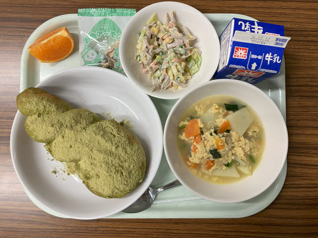 【献立】牛乳 まっ茶きな粉揚げパン ごぼうサラダ ふわふわスープ お魚アーモンド せとか