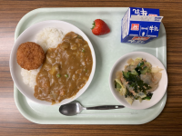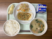 【献立】牛乳 ほうれん草のクリームスパゲティ フレンチポテトサラダ アーモンド でこぽん