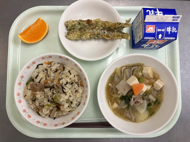 【献立】牛乳 ひじきご飯 ししゃもの香り揚げ 豚汁 ネーブル