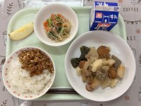 【献立】牛乳 ご飯 きびなごの唐揚げ 里芋と大根のそぼろ煮 たまねぎともやし...