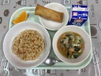 【献立】牛乳 キムチチャーハン ポテト春巻き 豆腐とキャベツのスープ オレンジ
