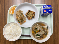【献立】牛乳 とり五目ご飯 豆あじの唐揚げ 韓国風みそ汁 ネーブルオレンジ