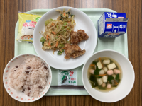 【献立】牛乳 ご飯 さばの竜田揚げ もやしのカレーサラダ さつまいものみそ汁 は...