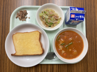 【献立】牛乳 フレンチトースト ポークトマトシチュー ツナサラダ ココアアーモン...