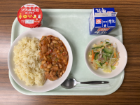 【献立】牛乳 麻婆丼 中華五目スープ お魚アーモンド いよかん