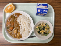 【献立】牛乳 花野菜カレーライス わかめとコーンのサラダ いよかん