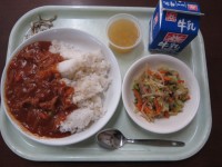 今日のこんだて:牛乳・煮干し・ハヤシライス・ごまドレサラダ・手作りりんごゼリー牛...