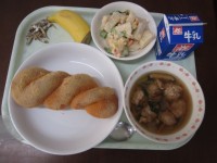 今日のこんだて:牛乳・煮干し・きなこ揚げパン・みそポテトサラダ・肉団子スープ・バ...