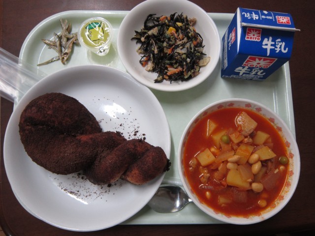 今日のこんだて:牛乳・煮干し・ココア揚げパン・ポークビーンズ・ひじきのごまサラダ・ひとくちゼリー