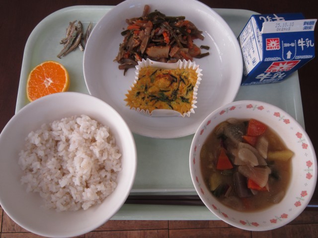 今日のこんだて:牛乳・煮干し・ご飯・ひじき入り卵焼き・茎わかめのきんぴら・さつま芋のみそ汁・みかん