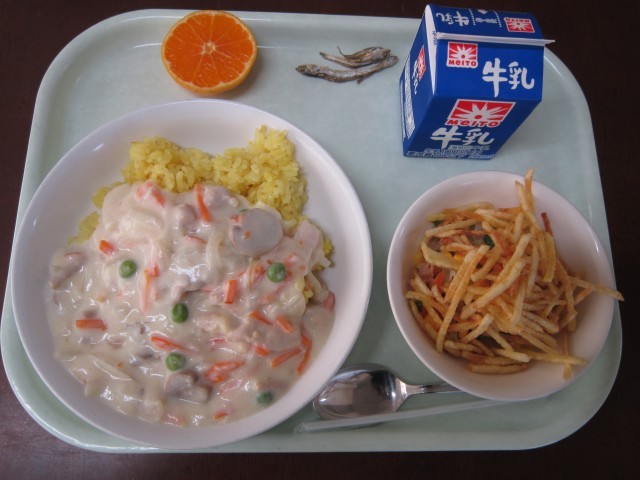 今日のこんだて:牛乳・煮干し・ターメリックライス・鶏肉のクリームソース・揚げじゃがサラダ・みかん