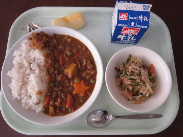今日のこんだて:牛乳・煮干し・カレーライス・福神漬け・大根サラダ・りんご