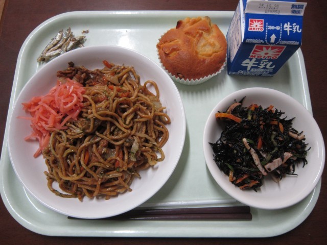 今日のこんだて:牛乳・煮干し・ソース焼きそば・ひじきのマリネ・手作りりんごケーキ