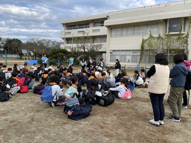 5年生の林間学校が始まりました。新木小学校の校庭で出発の会を行い、水郷小見川青少年自然の家に向けて出発しました。