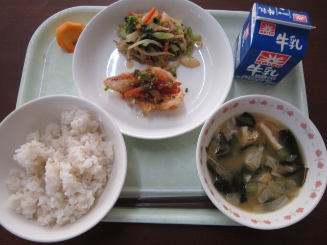 今日のこんだて:牛乳・ご飯・赤魚の南蛮漬け・野菜のごま和え・キャベツのみそ汁・新木小の柿