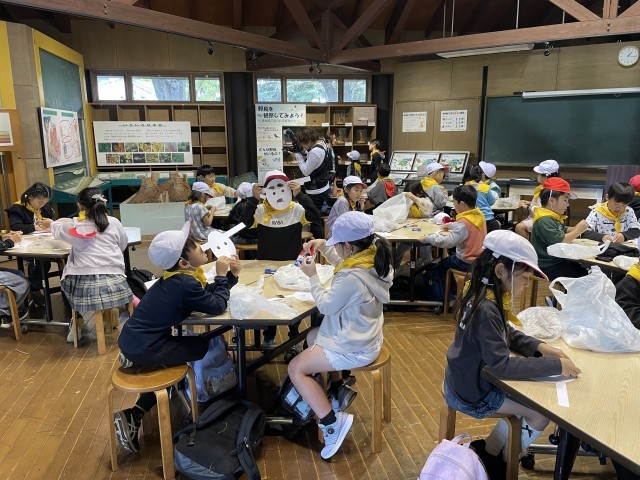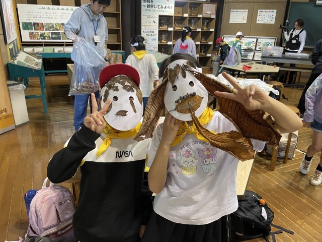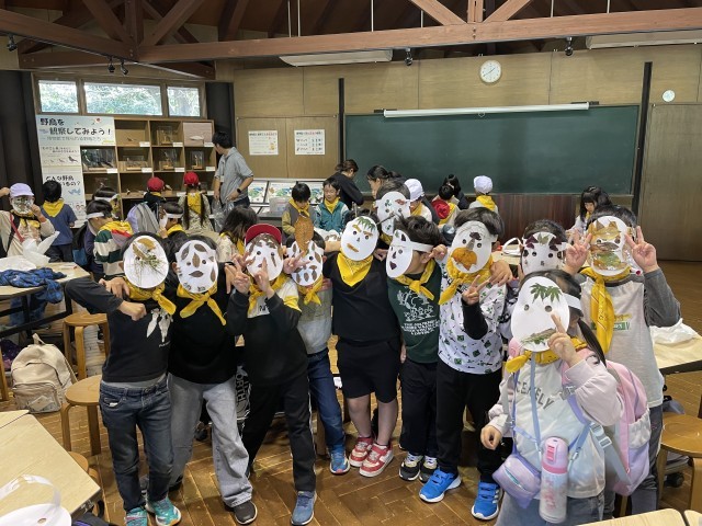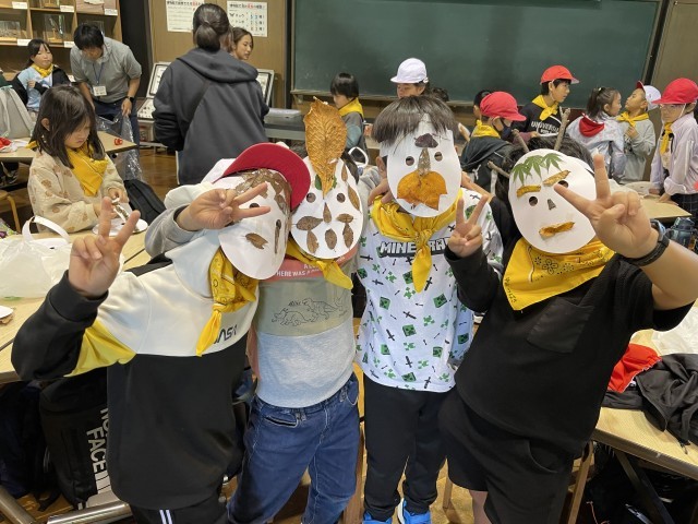 昼食後、落ち葉等の材料を集めて、お面作りをしました❗️子ども達はそれぞれユニークなお面を作ることができて満足そうでした❗️