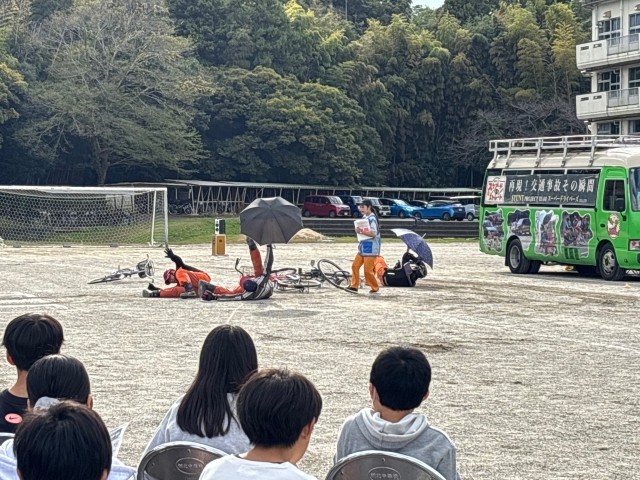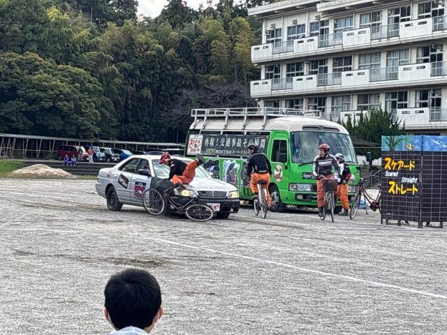いざ始まると、自転車と自動車がぶつかる瞬間や人が飛ばされる様子など、子どもたちは真剣な表情で見ていました。