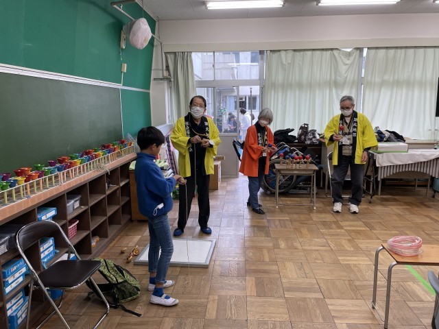 昔あそび体験のブースでは「湖北・新木地区社会福祉協議会」の方々にご協力いただき、子ども達が楽しんでいます。