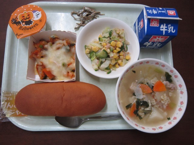 今日のこんだて:牛乳・煮干し・コッペパン・りんごジャム・かぼちゃのミートソース焼き・ツナとコーンのサラダ・アルファベットスープ・ハロウィンデザート