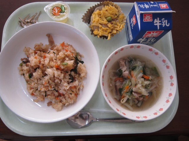 今日のこんだて:牛乳・煮干し・焼肉チャーハン・手作り菊花しゅうまい・野菜スープ・ひとくちみかんゼリー