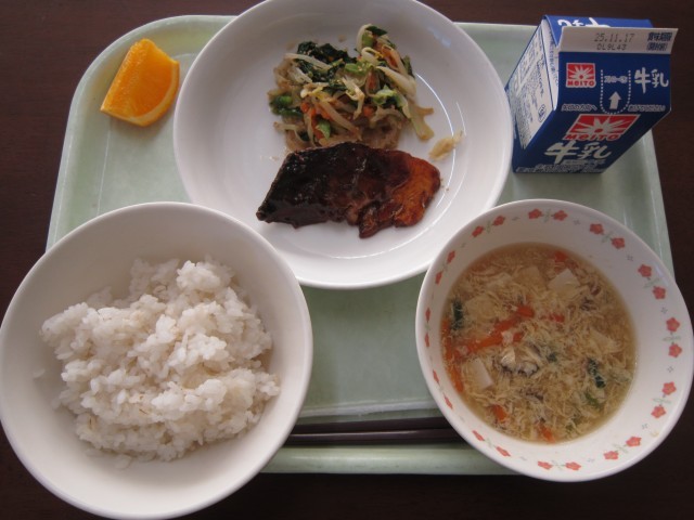 今日のこんだて:牛乳・ご飯・さばのみそ煮・野菜のごま和え・むらくも汁・オレンジ