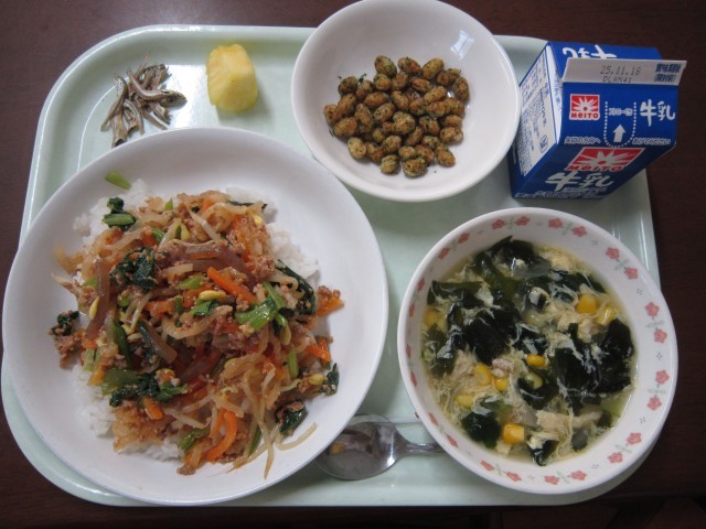 今日の給食 11月13日(木) 公開日 2025/11/17 更新日 2025/11/17 給食 今日のこんだて:牛乳・煮干し・ビビンバ・青のり大豆・わかめスープ・パイナップル揚げた大豆に、塩と青のりをまぶしました。かりっかりの食感に仕上がるように、大豆をあえて下茹でしないで、水戻ししたものをじっくり時間をかけて揚げました。