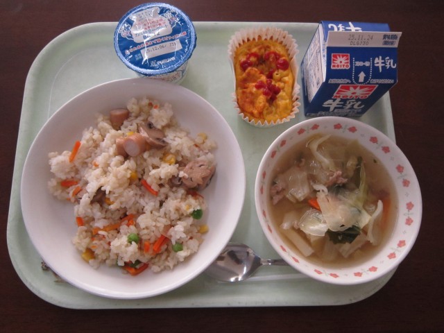 今日のこんだて:牛乳・煮干し・ウインナーピラフ・手作りミートオムレツ・じゃが芋入り野菜スープ・ヨーグルト