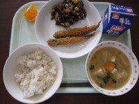 今日のこんだて:牛乳・ご飯・鰆のコーンフレーク焼き・ひじきの五目煮・お講汁・みかん