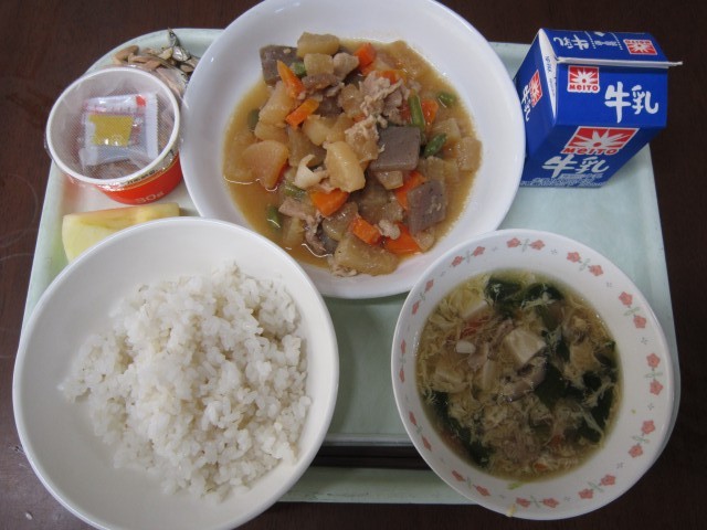今日のこんだて:牛乳・煮干し・ご飯・大根と豚肉のみそ煮・むらくも汁・りんご