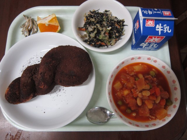 今日のこんだて:牛乳・煮干し・ココア揚げパン・ポークビーンズ・ひじきのごまサラダ・はやか