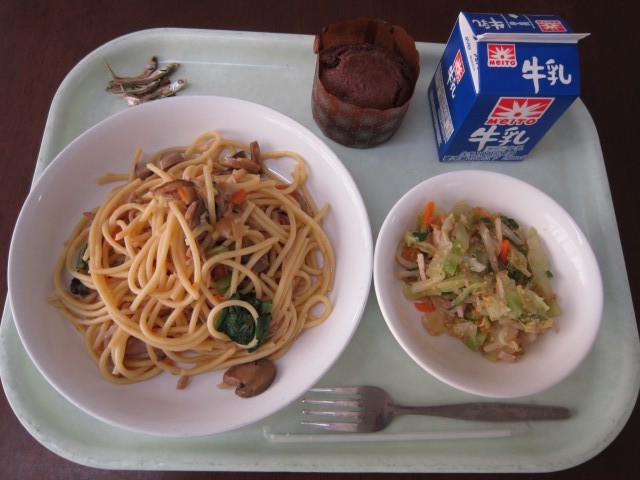 今日のこんだて:牛乳・煮干し・きのこスパゲティ・ごまドレサラダ・手作りチョコチップマフィン