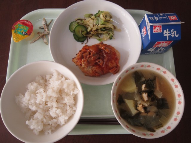 今日のこんだて:牛乳・煮干し・ご飯・手作り豆腐ハンバーグ・塩昆布和え・じゃが芋のみそ汁・ひとくちゼリー