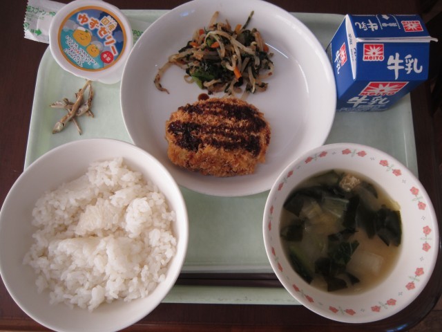 今日のこんだて:牛乳・煮干し・ご飯・手作りかぼちゃコロッケ・野菜ののり和え・白菜のみそ汁・ゆずゼリー