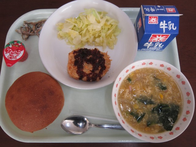 今日の給食 1月23日(金) 公開日 2026/01/27 更新日 2026/01/27 給食 今日のこんだて:牛乳・煮干し・丸パン・ごぼうコロッケ・ボイルキャベツ・中華コーンスープ・ひとくちゼリー手作りのごぼうコロッケです。炒めて味付けしたごぼうをコロッケの具材として使い、ごぼうのしゃきしゃきした食感と香りが楽しめるコロッケになりました。