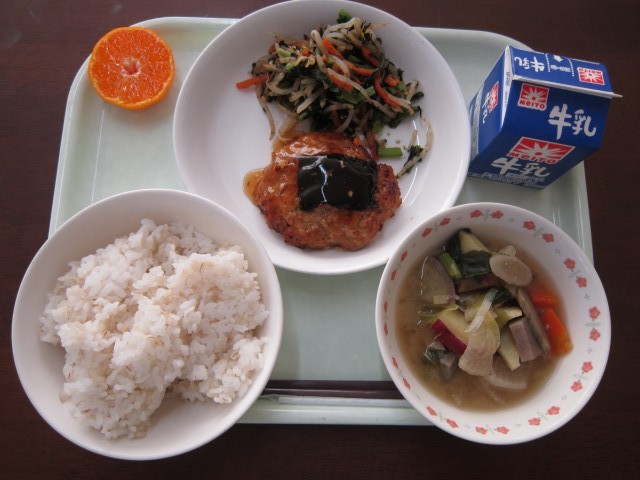 今日のこんだて:牛乳・ご飯・いわしのさんが焼き・野菜ののり和え・さつま芋のみそ汁・みかん