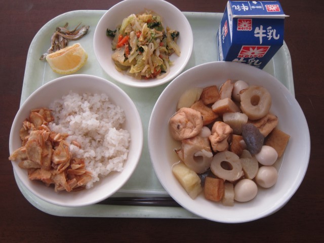 今日のこんだて:牛乳・煮干し・ご飯・ナッツごぼう・おでん・野菜のごま和え・はるか