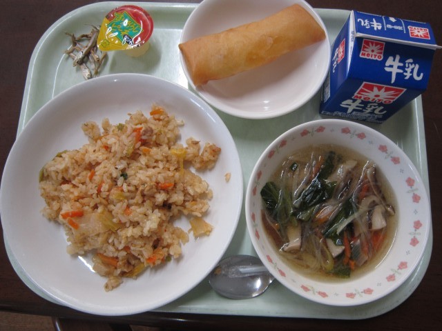 今日のこんだて:牛乳・煮干し・キムチチャーハン・手作りポテト春巻き・春雨スープ・ひとくちゼリー