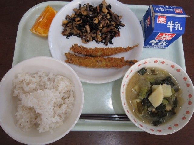 今日のこんだて:牛乳・ご飯・ししゃものカレーフライ・ひじきの五目煮・じゃが芋のみそ汁・でこぽん