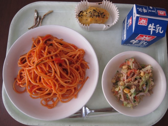 今日のこんだて:牛乳・煮干し・スパゲティナポリタン・ごぼうサラダ・手作りスイートポテト