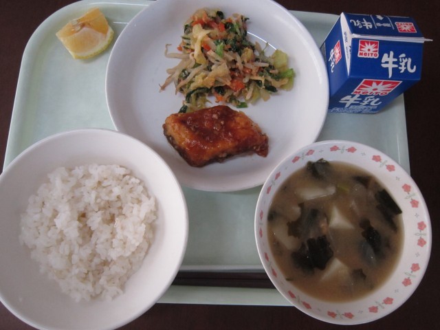 今日のこんだて:牛乳・ご飯・さばのユーリンチーソースがけ・野菜のアーモンド和え・じゃが芋のみそ汁・はるか