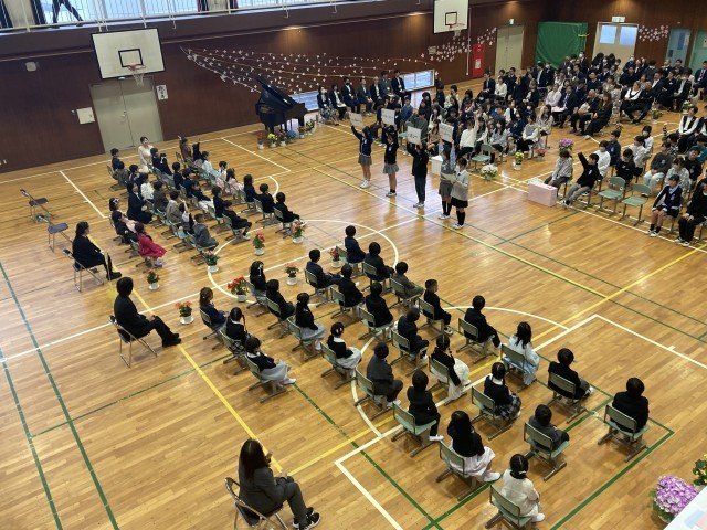 在校生代表として出席した6年生からは、「歓迎の言葉」や「校歌」のプレゼントがありました。和やかで温かい雰囲気の中、素敵な入学式となりました。