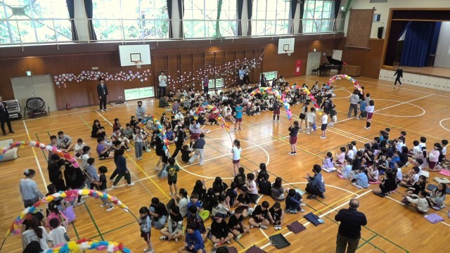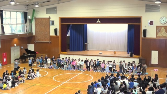 本日、「1年生を迎える会」を行いました。2年生から5年生のお兄さん、お姉さんたちが温かい拍手で迎える中、少し緊張した表情の1年生が6年生と一緒に入場しました。