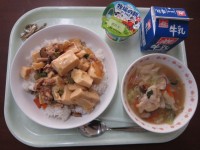 今日のこんだて:牛乳・煮干し・豆腐のうま煮丼・ワンタンスープ・ヨーグルト豆腐をた...