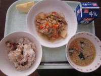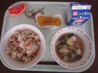 今日のこんだて:牛乳・煮干し・まいたけご飯・擬製豆腐・芋だんご汁・グレープフルー...