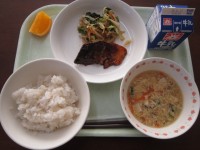 今日のこんだて:牛乳・ご飯・さばのみそ煮・野菜のごま和え・むらくも汁・オレンジさ...