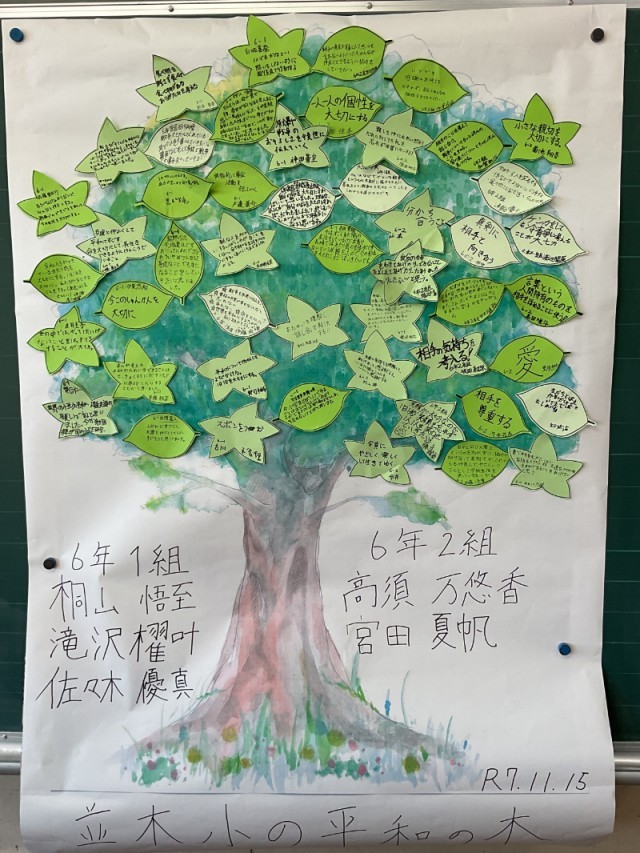 講座では、グループごとに『今の自分が絶対に失いたくないもの』を考えながら、最後には『平和な世の中にするために、今日から自分ができること』を配られたメッセージカードに記入して、『並木小の平和の木』を完成させました。